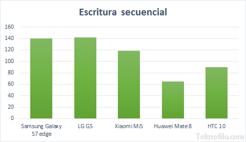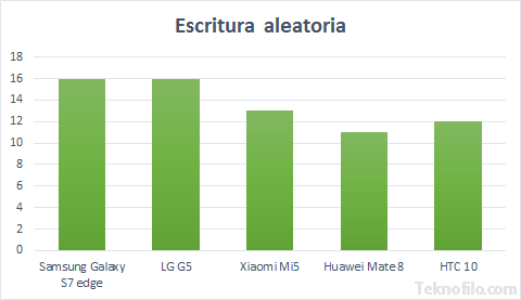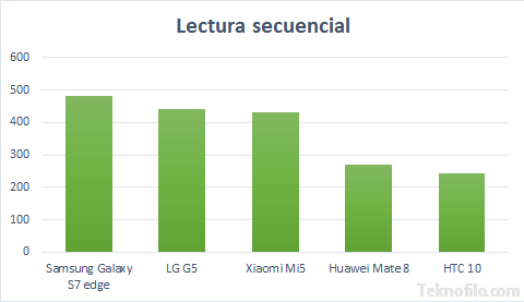 Estos valores muestran que la memoria UFS es considerablemente más rápida que la memoria eMMC 5.1 que encontramos en el HTC 10 y Huawei Mate 8. En media, la velocidad de lectura secuencial un 75% más rápida en los teléfonos de Samsung, Lg y Xiaomi que en los de Huawei y HTC.