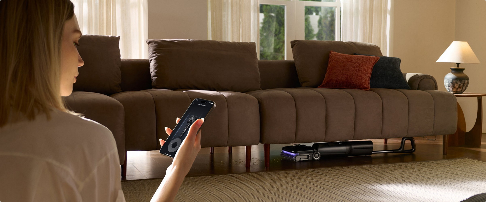 La función One-Touch Customization permite configurar rutinas de limpieza, controlar el estado de los consumibles y acceder a información en tiempo real mediante alertas de voz y pantalla integrada. También es posible dirigir el aspirador a zonas específicas, como debajo de sofás o camas, con total precisión.