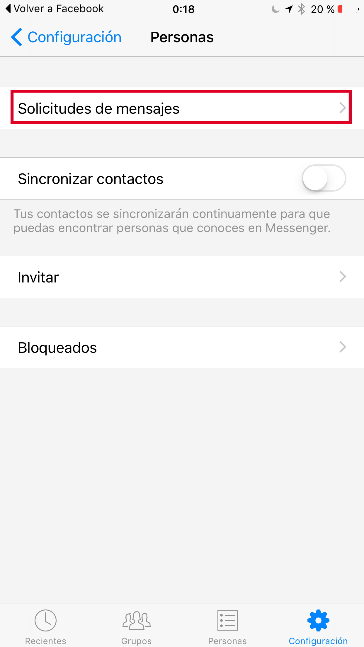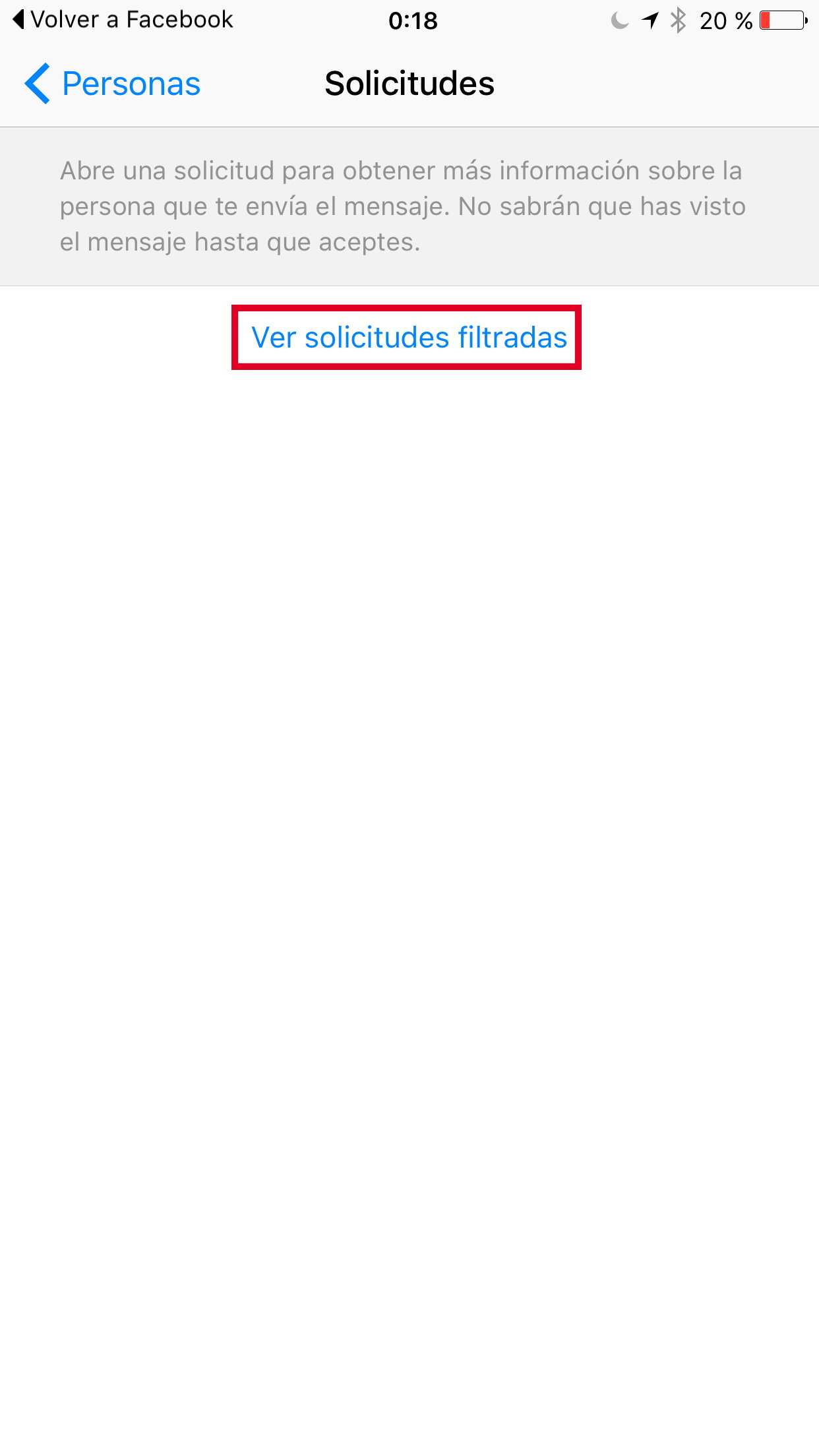 La forma de llegar a esta carpeta oculta varía según cómo accedas a Facebook. Si lo haces a través de la web, pulsa sobre el icono de Solicitudes de mensajes de la parte superior y obtendrás una lista de mensajes.