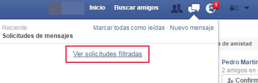 La forma de llegar a esta carpeta oculta varía según cómo accedas a Facebook. Si lo haces a través de la web, pulsa sobre el icono de Solicitudes de mensajes de la parte superior y obtendrás una lista de mensajes.
