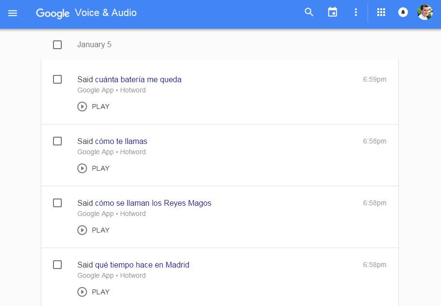 Si alguna vez has tenido un teléfono con el sistema de control por voz «OK Google» activado, esta página muestra una lista de todas las órdenes que le has dado, junto con un botón de «Reproducir» al lado de cada una de ellas.