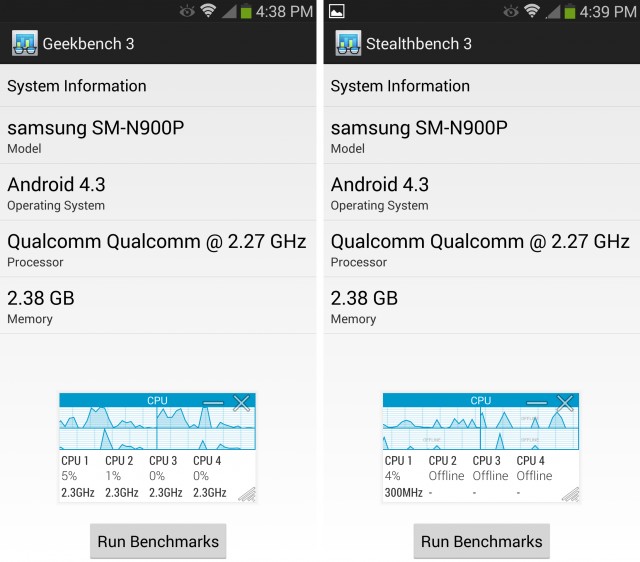 Para comprobarlo han cogido una aplicaci贸n de benchmark popular, Geekbench 3, y la han desensamblado, renombrado a Stealthbench 3 y reensamblado de nuevo. Cuando se ejecuta Geekbench, el monitor del sistema muestra que la CPU est谩 bloqueada a 2,3 GHz y todos los n煤cleos est谩n activos, pero en Stealthbech, las CPUs entran en reposo, apagan n煤cleos y cambian la velocidad, al igual que lo har铆an con cualquier aplicaci贸n.