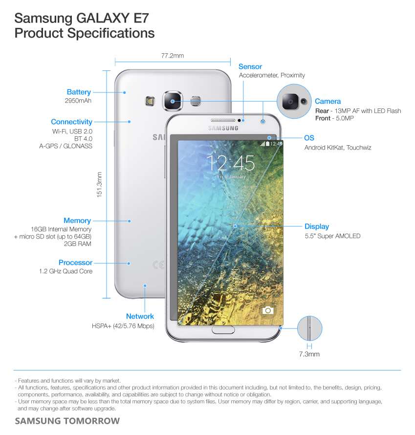El Galaxy E7 llega con las mismas características que el Galaxy E5 salvo por su pantalla 720p de 5,5″, la memoria RAM de 2GB, la cámara trasera de 13 MP, y una batería de 2.950 mAh.
