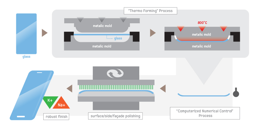Este proceso es el que permite a Samsung curvar el vidrio a los lados derecho e izquierdo. Por último, tanto el Galaxy S6 como el Galaxy S6 edge son tratados con «maquinaria de alta precisión para evitar el menor error.» El proceso conlleva 15 pasos complicados que incluyen pulir la superficie y los lados del cristal.