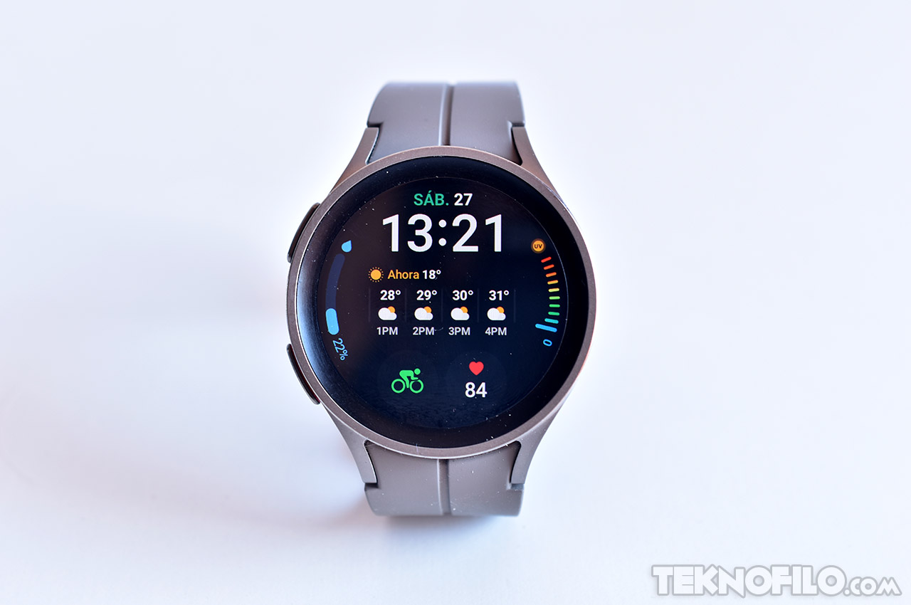 Una ventaja del Galaxy Watch5 Pro es que cuenta con un modo Pantalla Siempre Activa que mantiene la esfera visible en todo momento, con un brillo atenuado, mientras llevas el reloj puesto. Además, la pantalla no se limita a mostrar imágenes en blanco y negro, sino que también hace uso de color.
