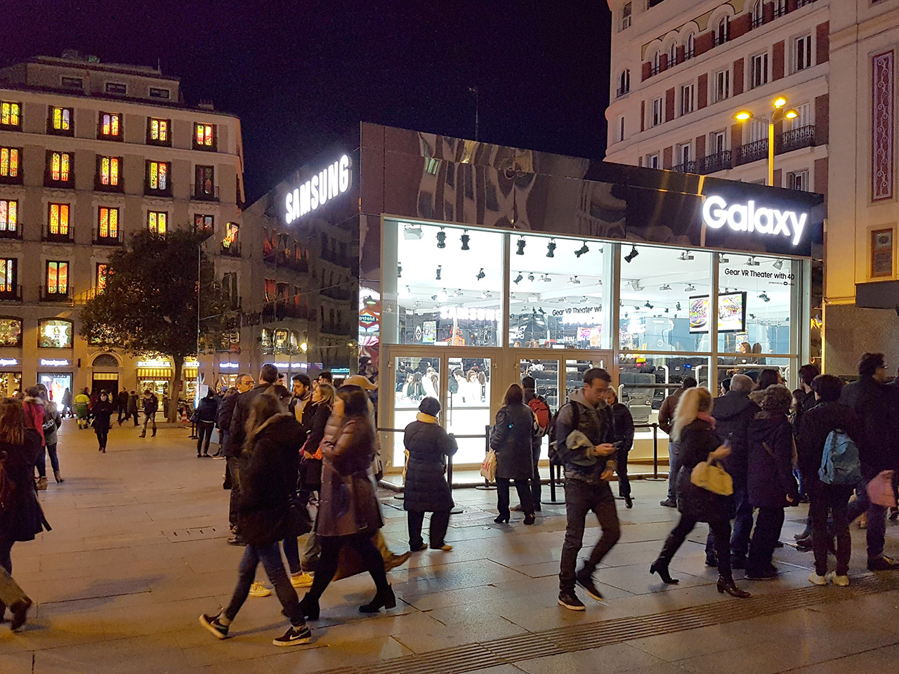 Samsung ha instalado en la Plaza del Callao de Madrid un cubo acristalado que alberga un teatro de realidad virtual 4D Studio para dar la bienvenida a los nuevos smartphones Samsung Galaxy S7 y S7 edge.