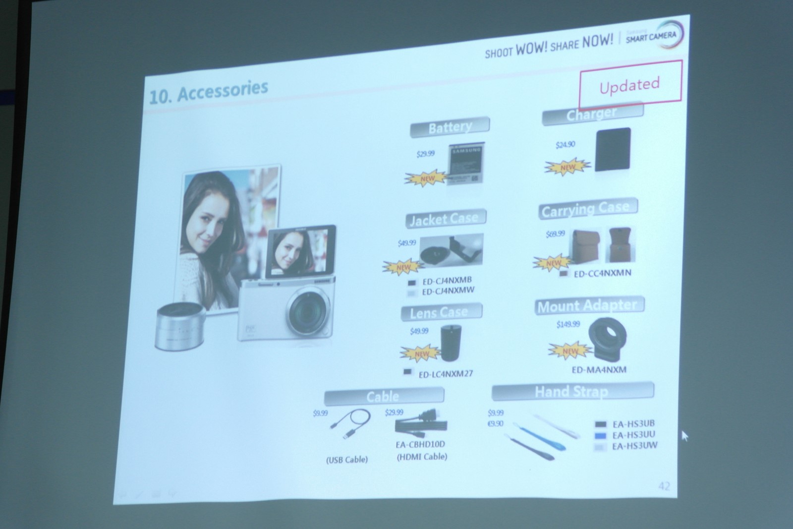 Los detalles sobre este nuevo modelo son escasos, si bien los rumores apuntan a que correrá Tizen. Una transparencia filtrada junto a la fotografía revela que se ofrecerán kits de objetivos sin espejo intercambiables, con distintas especificaciones como nivel de zoom o tamaño de la apertura. Tendrá una batería de 2.330 mAh que permitirá capturar 682 fotos en una sola carga, así como estabilización óptica de imagen.