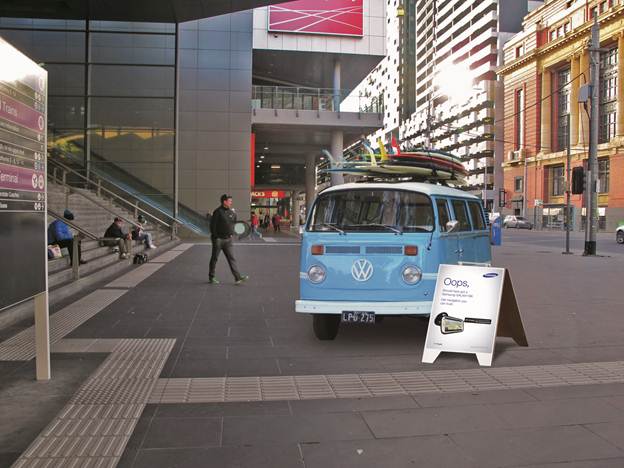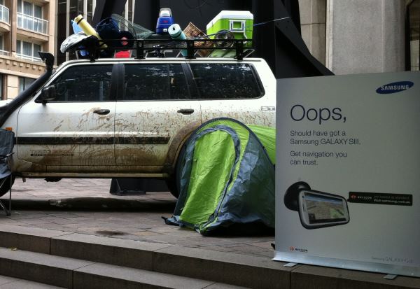 Ha colocado vehículos supuestamente extraviados en el centro de Sydney y Melbourne  junto a un cartel donde se lee «Uy, debería haberme comprado el Galaxy S3. Consigue el navegador del que te puedes fiar», en alusión al software Navigon GPS que viene por defecto en el Galaxy S3.