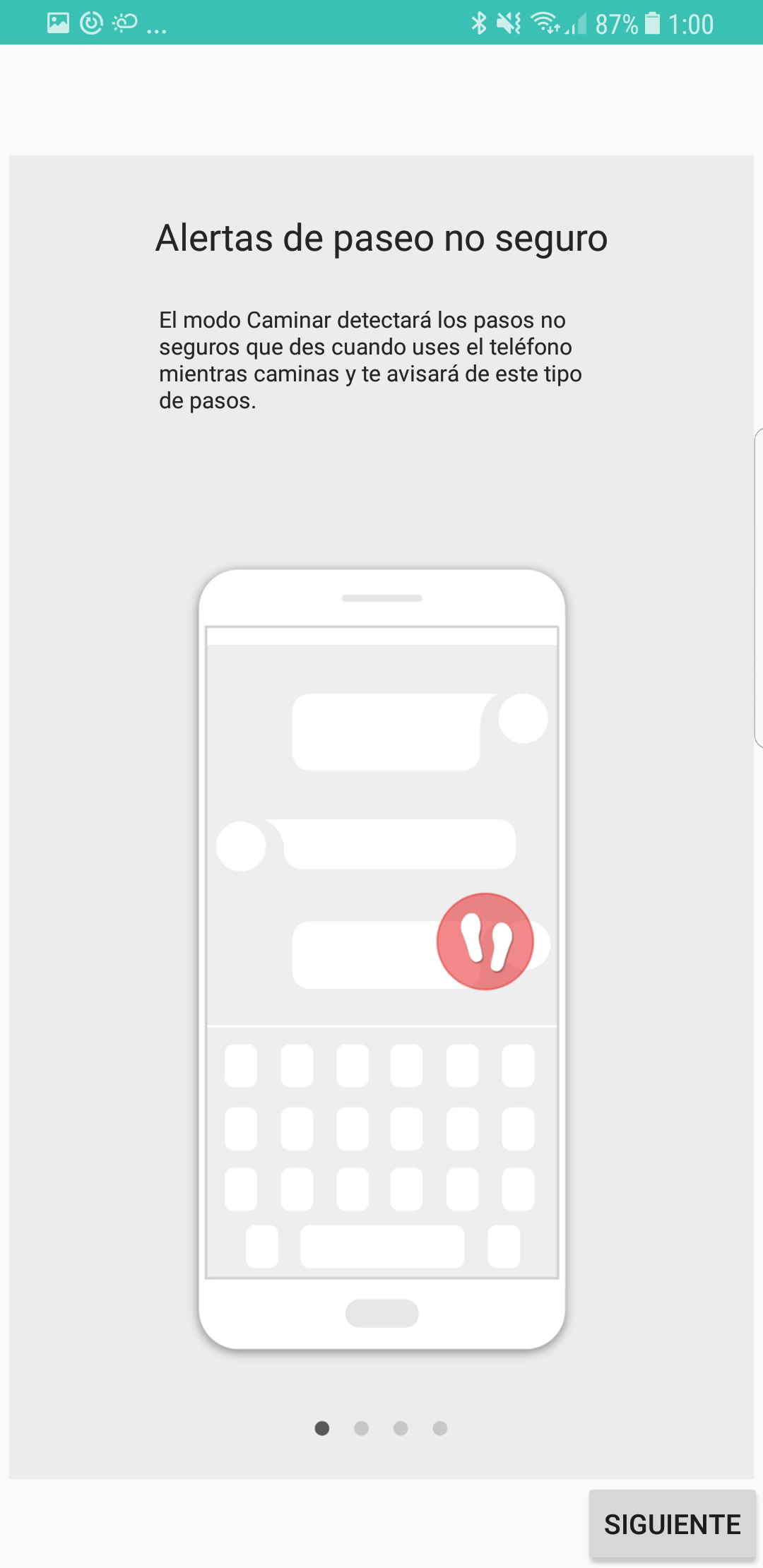 El Modo Caminar llega en cuatro modos diferentes. Por ejemplo, las «Alertas de Paseo no seguro» detectan los pasos no seguros cuando utilizas el teléfono mientras caminas y te avisará de este tipo de pasos.