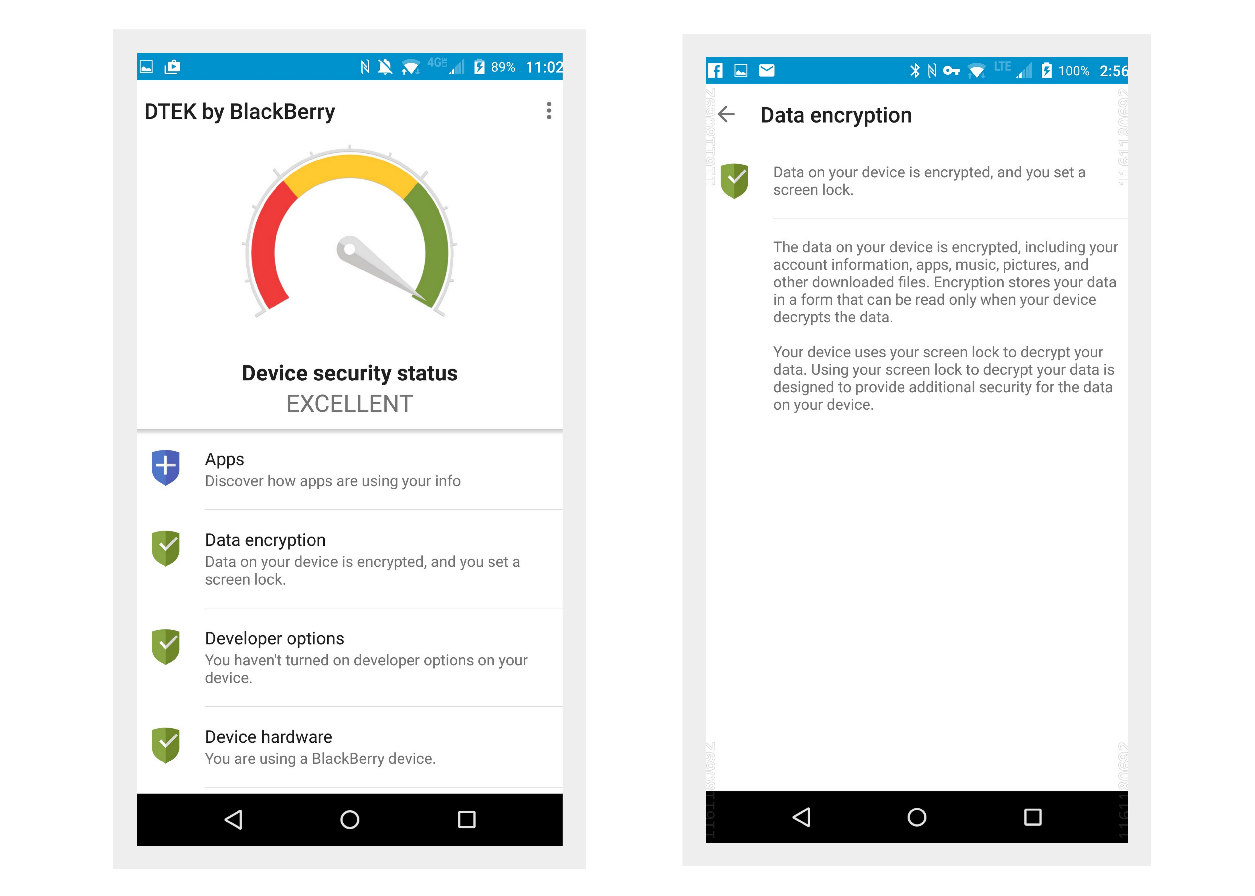 También podrás gestionar y proteger tu privacidad con la aplicación DTEK de BlackBerry, que te permite ver qué datos personales son accedidas por aplicaciones, el nivel de seguridad según la fuerza de la contraseña, los ajustes de cifrado y más.