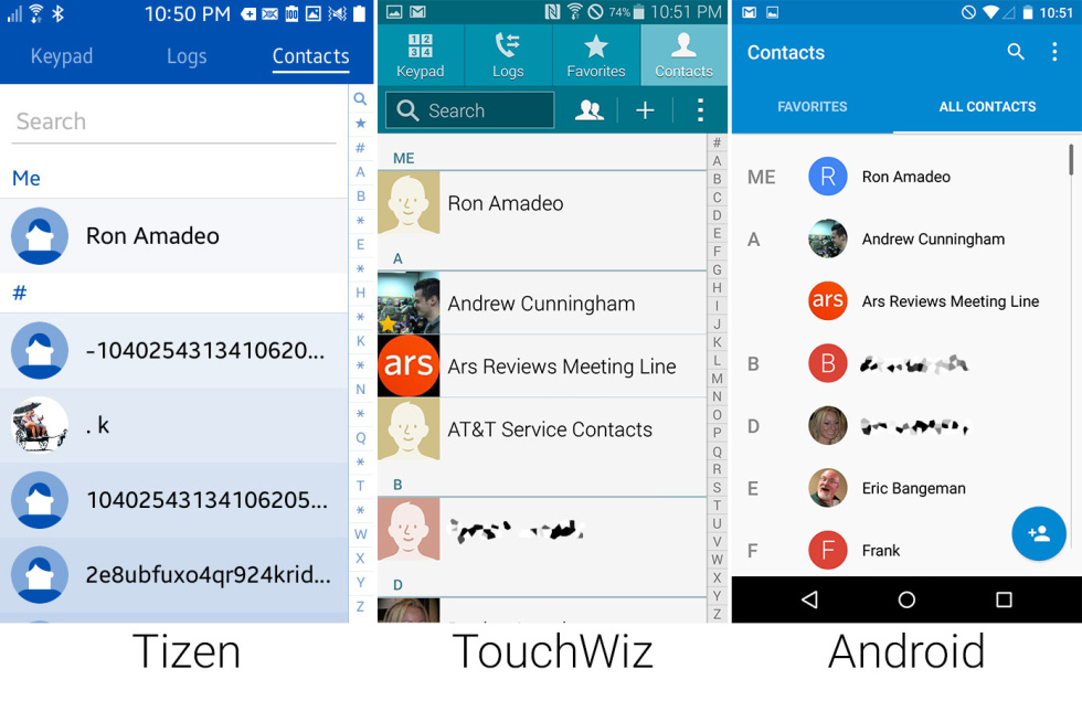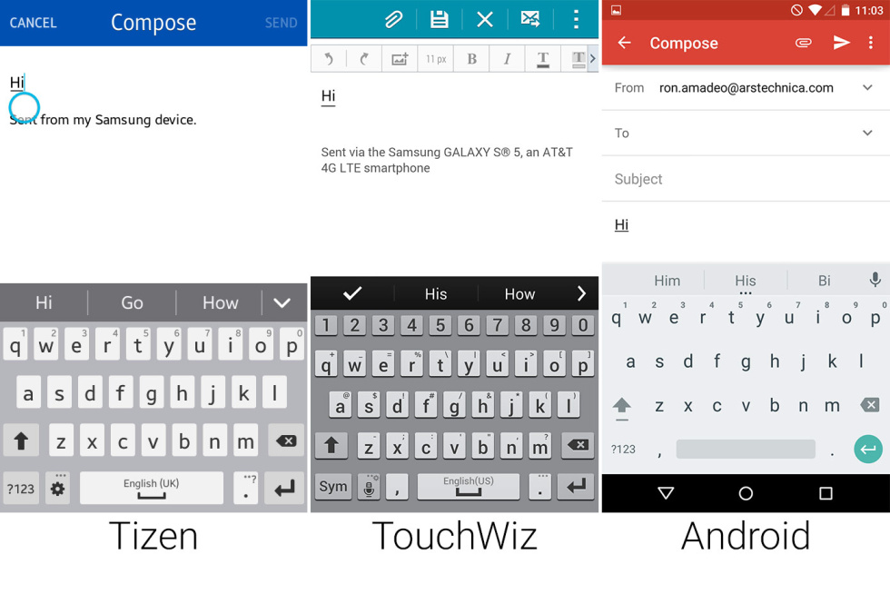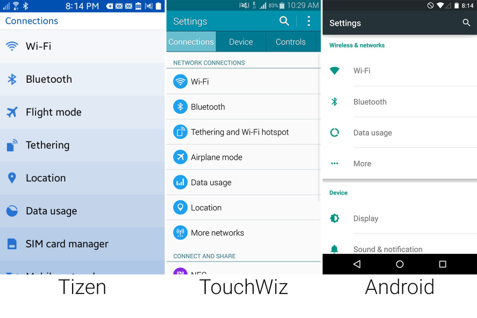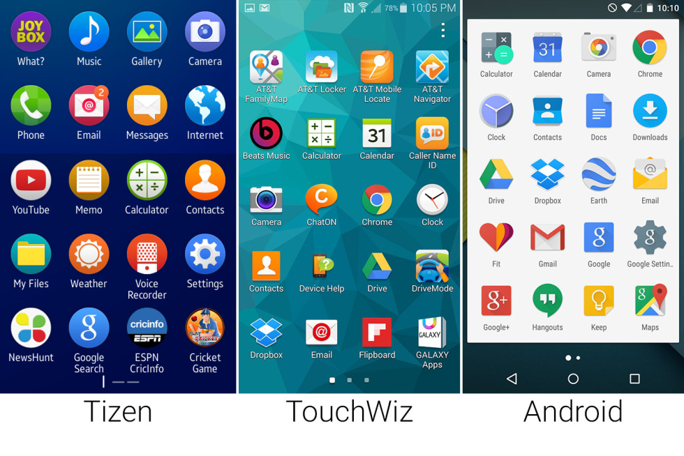 El interfaz TouchWiz debe seguir las líneas marcadas por Google, mientras que en el caso de Tizen la compañía tiene total libertad ya que es un sistema operativo desarrollado «en casa». A continuación podemos ver una comparativa entre los interfaces de Tizen, TouchWiz, y Android puro.