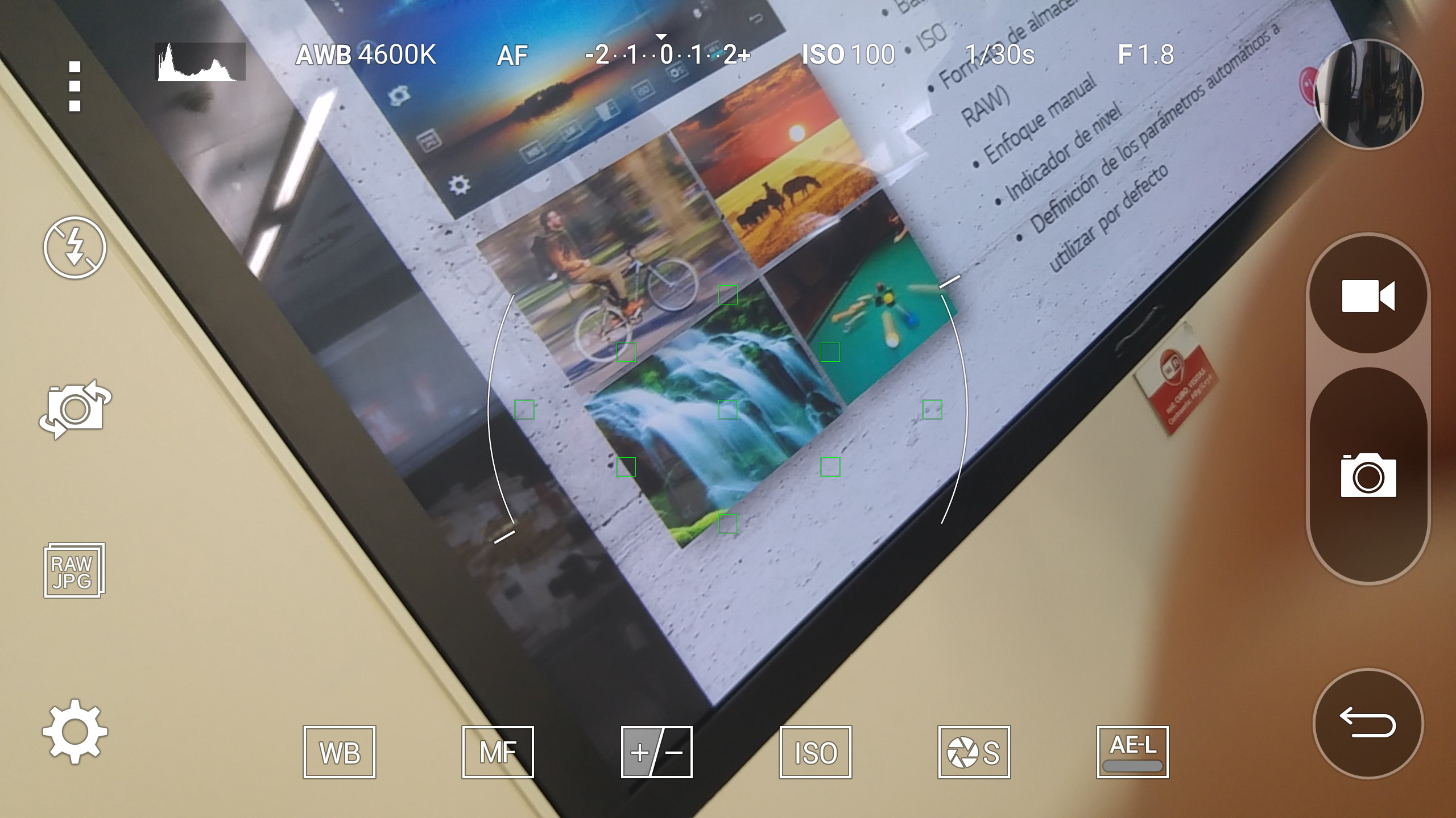 El software de cámara del LG G4 incorpora un modo profesional que permite ajustar muchos parámetros para conseguir una foto perfecta: velocidad de obturador, nivel de exposición, balance de blancos, ISO, formato de almacenamiento (JPG o RAW), enfoque manual, e indicador de nivel.