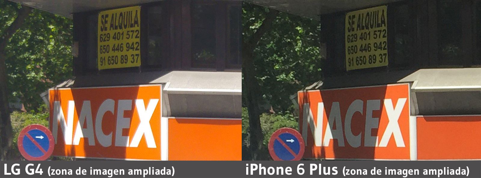 A continuación podemos ver una zona ampliada de una imagen captada por un LG G4 y un iPhone 6 Plus. Aparentemente la imagen captada por el LG G4 sufre un post-procesado de ruido más agresivo que la del iPhone 6 Plus.
