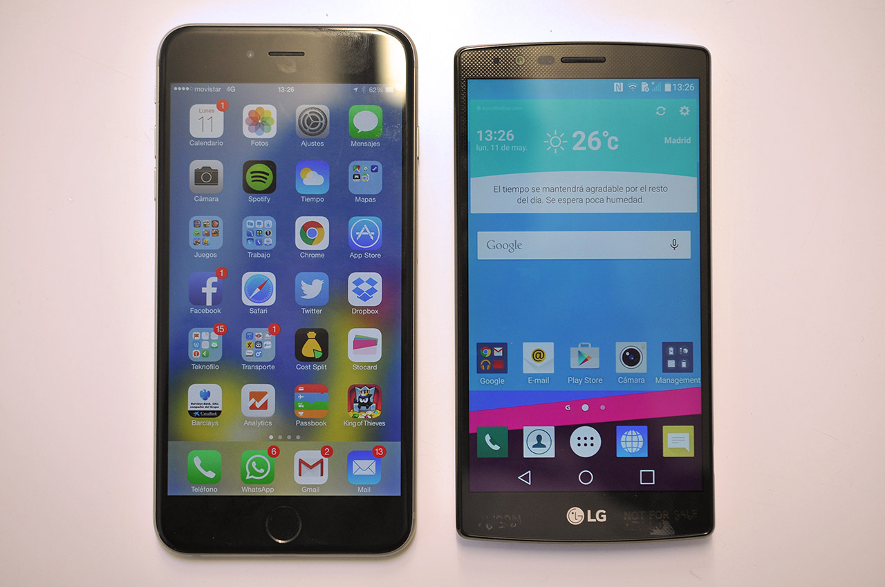 Se trata por tanto de un teléfono tamaño phablet, aunque si lo comparamos con el iPhone 6 Plus, que posee una pantalla de igual tamaño, las dimensiones de alto y ancho del LG G4 son más reducidas, como se puede apreciar en la foto anterior. Sin embargo, el iPhone 6 Plus es más delgado que el LG G4: 7,1 mm frente a 9,8 mm.