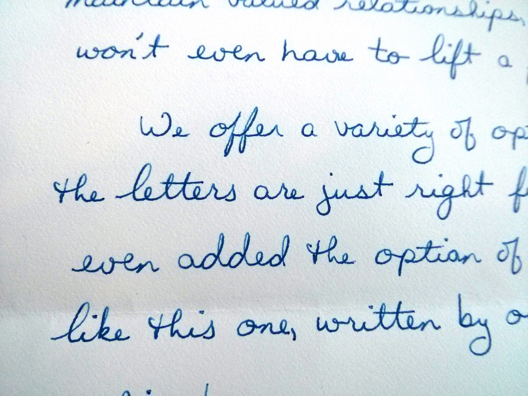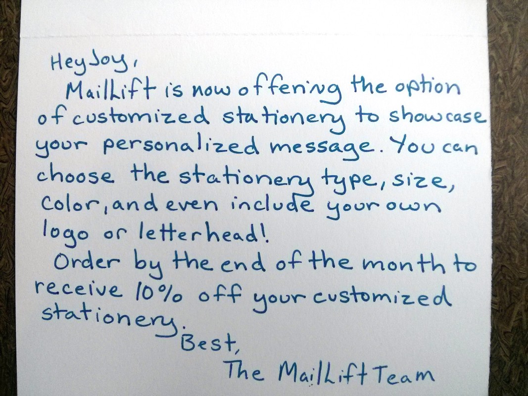 Las compañías de marketing son conscientes de ello y están buscando nuevas formas de captar nuestra atención con cartas que parecen haber sido escritas pacientemente por un humano. Existen compañías como Maillift que utilizan equipos de personas de carne y hueso con buena caligrafía para escribir cartas personalizadas.