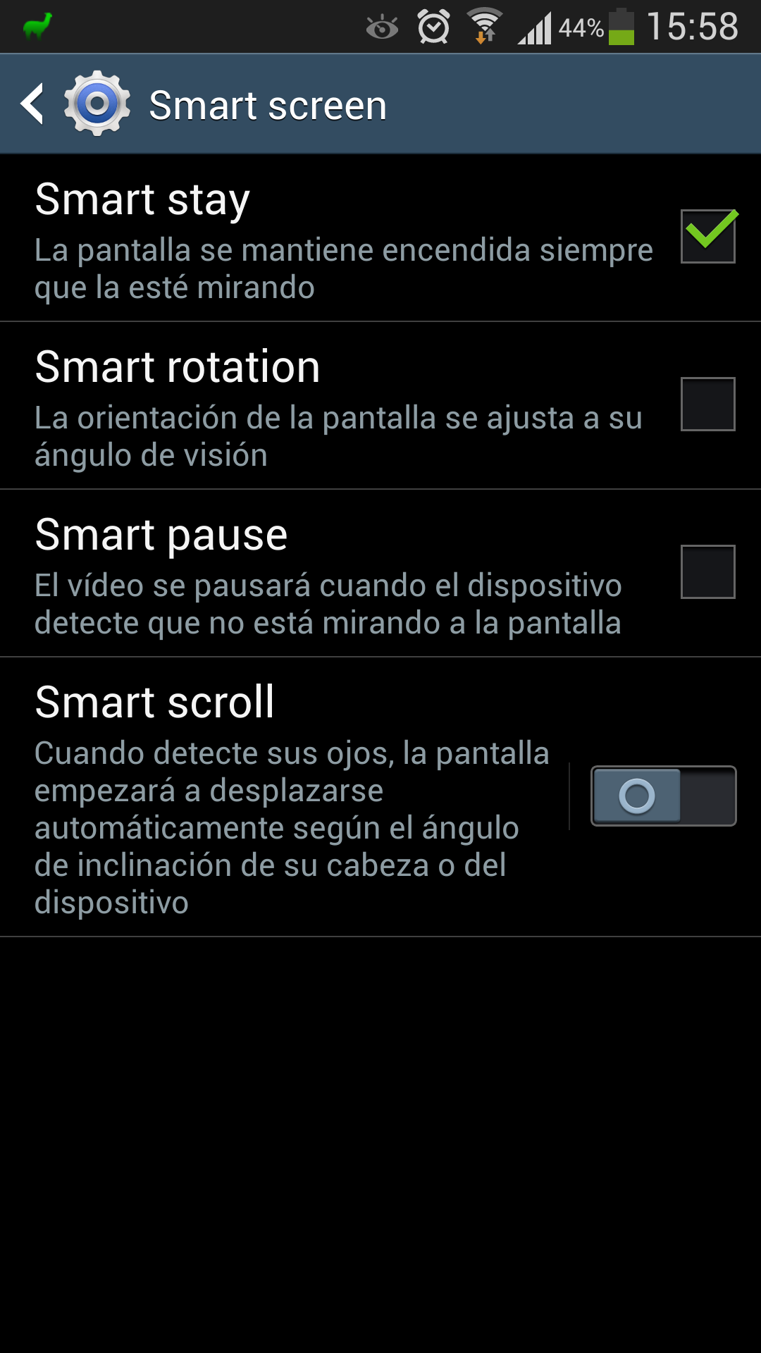 Si no utilizas estas opciones, desactívalas y notarás que la batería tiene más autonomía, especialmente si utilizas mucho el navegador (consumo de Smart Scroll) y ves vídeos (consumo de Smart Pause).