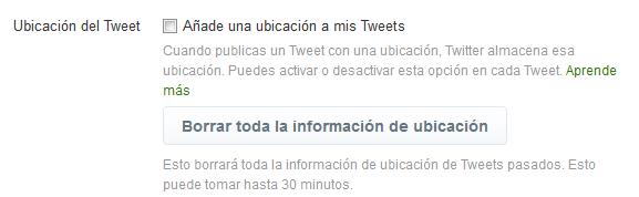 Ahora junto a Ubicación del Tweet puedes desactivar la caja que dice Añade una ubicación a mis Tweets para no utilizar esta funcionalidad. Para borrar toda la información de ubicaciones de tweets pasados, utiliza el botón que hay debajo.