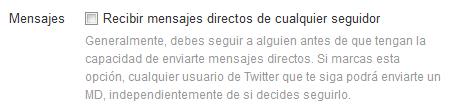 «Si marcas esta opción, cualquier usuario de Twitter que te siga podrá enviarte un MD, independientemente de si decides seguirlo.» dice una nota que acompaña a esta opción.