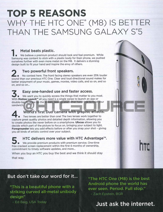 Un documento de formación sobre el HTC One M8 explica por qué es mejor que el Samsung Galaxy S5