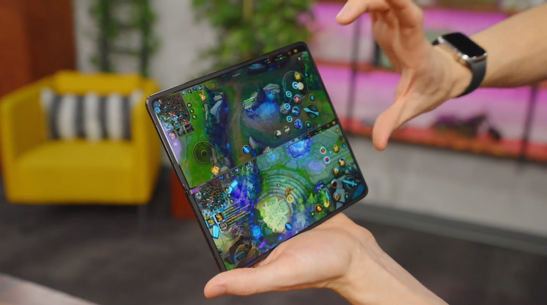En un vídeo, un Youtuber juega a Wild Rift en el HONOR Magic V2, controlando a dos personajes al mismo tiempo y, finalmente, derribando al equipo rival.