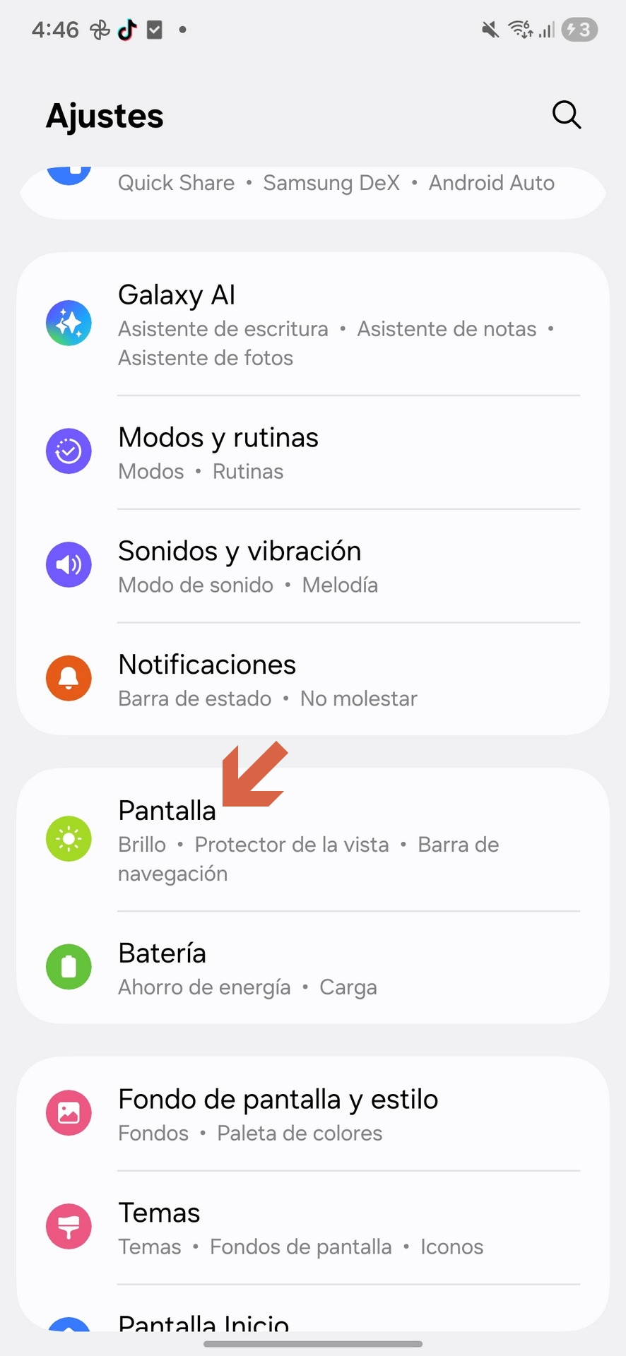 Puedes hacerlo directamente desde el panel de ajustes rápidos: desliza dos dedos desde la parte superior de la pantalla y busca el icono de Protector de la Vista. Si no aparece, también puedes acceder desde la app de Ajustes, dentro del apartado “Pantalla”.