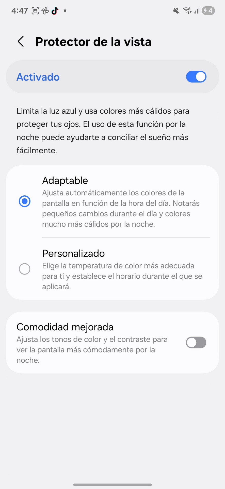 Una vez activado, notarás un ligero cambio en el tono de la pantalla. Protector de la Vista funciona de forma adaptativa por defecto, ajustando automáticamente el color según la hora del día y la iluminación ambiental.