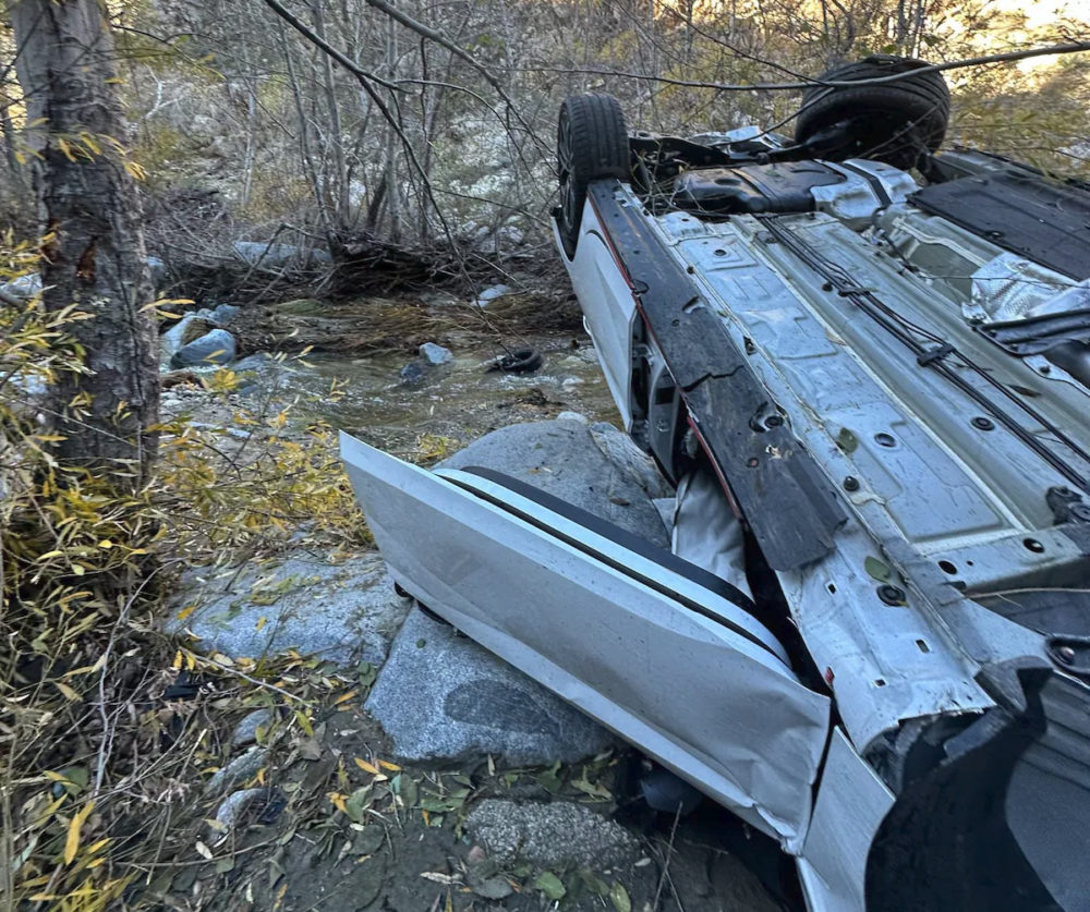 El Hyundai Elantra de Cloe Fields y Christian Zelada perdió adherencia con la grava en el arcén de la autopista Angeles Crest, en California, y cayó por un cañón de 90 metros de profundidad. Por suerte, la pareja no sufrió heridas graves.