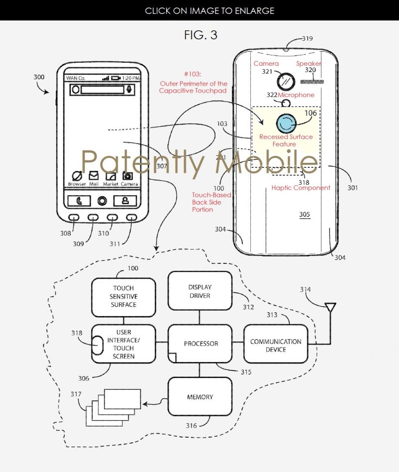 La patente describe algunas aplicaciones prácticas del panel trasero táctil, como la posibilidad de controlar la reproducción de música, hacer zoom mientras navegas por Internet, o hacer scroll en un documento.