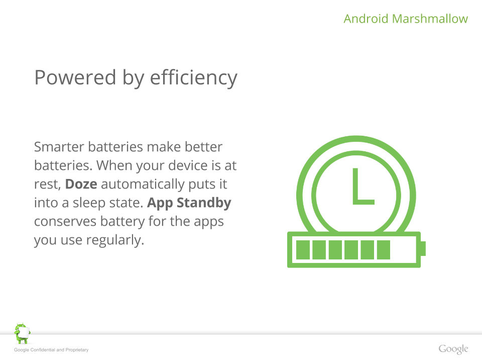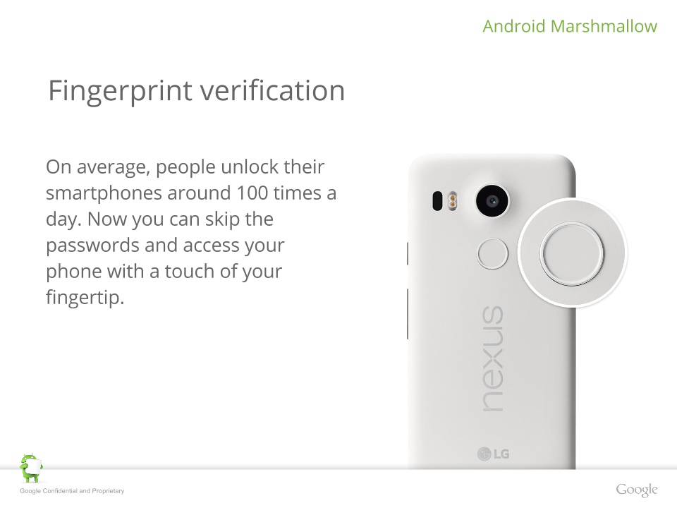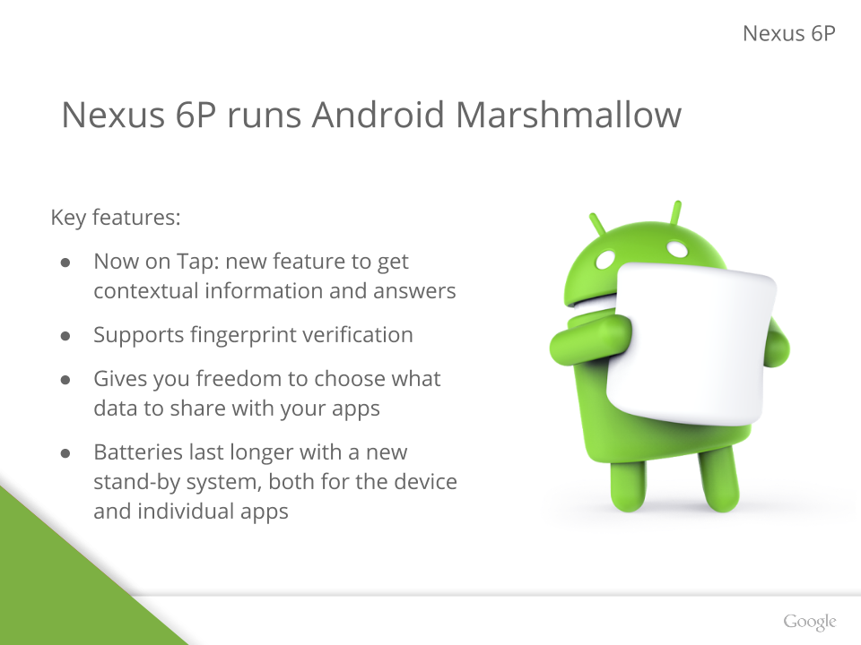 Otras páginas mencionan los beneficios de Android 6.0 Mashmallow y la funcionalidad Now On Tap, y la última transparencia confirma que el teléfono se comercializa en versiones de 32, 64 y 128GB de capacidad y en cuatro variantes de color: aluminio, grafito, escarcha y Oro.