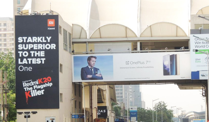 En las imágenes adjuntas podemos ver una valla de OnePlus donde promociona el OnePlus 7 Pro junto al rostro de Robert Downey Jr. Totalmente pegada a esta encontramos otra valla colocada por Xiaomi que dice «Claramente superior al último One» y, en la esquina, aparece nombrado el Redmi K20 como «The Flagship Killer.»
